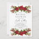 I eleganten har inbjudningskort för möhippan en strålande röd poinsettimiblomma med grön färg. Inbjudan är perfekt för att fira den kommande bruden under julhelgen. På framsidan av inbjudan finns de röda poinsettierna blommor och grönska, tillsammans med bridens namn, datum, tid och plats för duschen. Den övergripande utformningen är festlig och sofistikerad, och inbjudan kommer säkert att imponera på dina gäster.
