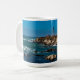 Det vackra kaffet mugg har ett solariskt dagsljus av kusten och berömd Point Arena Lighthouse, Mendocino County, Kalifornien.