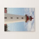 Fyrtorn vid Point Prim på Prince Edward Island, Kanada mot grumlig blå himmel på solig dag.