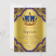 Lyxig kunglig blå och guldfärgad prins dop inbjudan med blå och guldkrona på en vacker kunglig blå och guldsnurrig bakgrund. Denna utsmyckade blå och guldfärgade prins dop inbjudan kan enkelt anpassas för din tillställning genom att lägga till din evenemangsinformation, typsnitt, teckenstorlek och färg samt formulering.