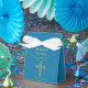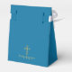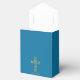 Modern gemensam favoritbox med en gyllene kor på blå bakgrund och ett handskrivet skript namn. Anpassa till namn, text och datum.