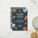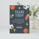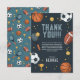 Detta coola och moderna idrottsteman design för barnkalas tackkort har en blå sportillustration med en basketboll, fotboll, fotboll, tennisracket, trofé och stjärnor. Kortet kan anpassas med din pojkes namn och tackmeddelande.