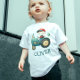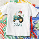 Denna personliga småbarns-t-shirt har en fantasifull pojke på en söt grön traktor.