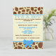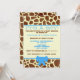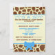 En barnduschinbjudan med en bakgrund av girafftryck på fram- och baksidan. Framsidan har blå trim och blå bog på grund. Anpassa den blå och bruna texten i mitten med information om tillfälle. Leta efter andra giraffa utskrifter på Jill's Paperie.