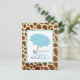 En barnduschinbjudan med en illustration av ett blått paraply över en girafferad bakgrund. Anpassa texten på baksidan med information om tillfälle.