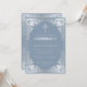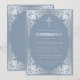 Denna eleganta dammiga blå och silver första kommunion inbjudan med en vintage känsla, rekommenderas för en pojke, har en utsmyckad falsk silverfolie ram med eleganta barocka silvergrå dekorationer på en dammig blå bakgrund. Ovanför texten finns ett religiöst kors i falsk silverfolie. Förutom tillfället "First Holy Communion", som också är i falskt silver, kan all text anpassas och har en silvergrå färg liknande den falska silverramen.