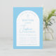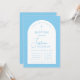 En modern välvd, blå och vit pojkdopsinbjudan. I den övre delen finns ett kors med välvd text ovanför. Förnamnet är skrivet i script, ovanför efternamnet. Ceremoniinformation och mottagningsinformation finns på två kolumner åtskilda av en linje. Texten, linjerna och valvets färg är babyblå, bakgrunden är vit.