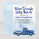 Inbjudan till drive-through bebisfest med söt blå lastbil, ballonger och banderoll på en blå akvarellbakgrund. Denna inbjudan till covid-bebisfest kan enkelt anpassas för ditt evenemang genom att helt enkelt lägga till dina evenemangsuppgifter.