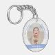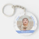 Trendig, nyckelkedja av typen nyfödd bebis i klassy personlig med ett vitt ram med en rundöppning för ett foto av vågrät anpassningsbar och ett böjt blått band på vardera sidan som visas på namn eller namn och födelsedatum för den lilla pojken i ett typsnitt/typografi av eleganten. Observera att du kan välja att köpa den här nyckelkedjan ensidigt. I den här designen ingår ord "I kärlek you, Godmor Johanna!", som du kan anpassa eller ta bort. Det omfattar också en cirkel av vit och silver snöflingor och stjärnor.