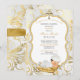Vackert pojke i sitt döende kostym och guld kor halsband som sover vid en guld-kudde. Inbjudningsbakgrunden är vit med rullan guld. Baksidan är försedd med menyfliksområdet & kor.