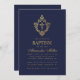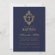 Den här elegant marinens och guld baptismens inbjudan med en vintage luft, som rekommenderas för en pojkens dödande, har en vapensköld för vintage blommigt i faux guld foil, som har kor i den, även i faux guld foil. Pojken namn är skriven i ett elegant kalligrafiskt skript. All text kan vara personlig och ha ett gyllene färg som liknar faux guld vapensköld. Bakgrunden är marin blå. Den vintage blommigtens vapensköld från ett gammalt bok-täcke, från bok, "Rust, Smut Mildew & Mold", från 1870, nu offentligt.