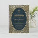 Denna eleganta dopbekräftelseinbjudan med vintagekaraktär har en förgylld ram med spiralvridna bladdekorationer i guld på en mörk marinblå bakgrund. Texten är placerad i en oval med förgylld ram och har ett gyllene kors ovanför. Pojkens namn är skrivet med en elegant kalligrafisk skrift. All text kan anpassas och har en gyllene färg liknande gulddekorationerna på ramen.