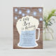Roligt ett pojke brinner par babydusch med en öl mugg fylld med blåöl satt på en rustisk träbakgrund med hängande mason burk ljus