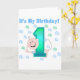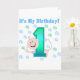 En pojke i en tidningspärva bakom ett stort nummer ett och texten lyder "Det är min födelsedag" på första födelsedag, t-shirts, kroppskostymer, knappar, magneter med mera.