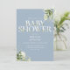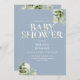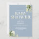En elegant baby shower-inbjudan med elegant typografi och vacker botanisk grönska på en dammig blå bakgrund och din QR-kod på baksidan. Designad av Thisisnotme©