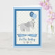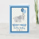 Det här pojke-kortet har en grått-elefant med två blå ballonger och en ljusblå polka-punktbakgrund. Under elefanten är en blå båge med texten "hej baby" och tre grått hjärtan.