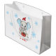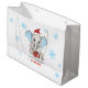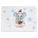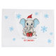 En berömvärd pojke-elefant med julhatt, en julklapp, en käpp-godis och en snöbakgrund med vackert snöflingor. Pojke första julen Helgdagar. Anpassa genom att byta namn.