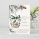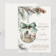 Välkommen den nyaste medlemmen i din familj med denna eleganta vintertema-inbjudan till babyfest. Denna unika design visar en söt babysäng för pojke inuti en lysande julgrynsdekoration, prydd med mjuka gröna toner, kottar och ömtåliga vintergrenar. Ett vackert grönt band lägger till en sista touch, vilket gör den till den perfekta inbjudan till en babyfest för pojke under vintersäsongen.