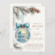 Fira den kommande ankomsten av din lilla pojke med denna fantastiska vintervacker barnkalasinbjudan! Med en söt blå babysäng och gungstol inklämd i en glödande julgranskula skapar denna design en magisk och mysig vinteratmosfär. Mjuka tallgrenar, kotte och ett blått band bidrar till den festliga charmen, vilket gör den till den perfekta inbjudan till en vinterbarnkalas.