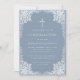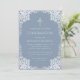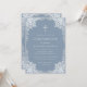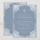 Denna eleganta, dammiga blå bekräftelseinbjudan med vintage-känsla, rekommenderas för en pojke, har en utsirad falsk silverfolierad ram med silvergrå blad på en dammig blå bakgrund. Ovanför texten finns ett kristet kors i falskt silverfolie. All text kan anpassas och har en grå färg som liknar den falska silverramen.