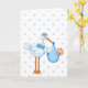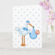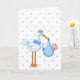 Blå baby-design för pojke med stork med pojke på blå hjärtbakgrund. Kortet skulle kunna användas för inbjudningar till babydusch, tillkännagivande för födelse eller gratulationskort. Lägg bara till texten som kostym tillfälle.