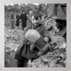 Gamla WW2-foto från övergiven pojke som höll ett mjukisdjur leksak i ruiner efter tyska flygbombningar av London. Bild togs 1945 av fotografen Toni Frissell.