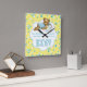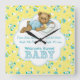 Söt anpassad design i mjuk gult och akvblått med stjärnor, baby flaskor och onsie outfits. Baby nalle lägger på en kudde. I området nedan finns redo att anpassa med namn och födelsedatum. Grund på banderollen har välkomnat Baby textkonst från Sweet.