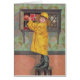 Vintage barnens bild av en pojke i en regnrock i ett skåp.