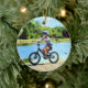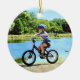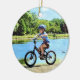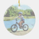 Den här lilla pojken låter sin fantasi springa vara fri när han rider sin cykel runt sjö i parken.