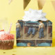 En ung pojke håller en skiftnyckel medan han står bredvid en vintage blå bil med en registreringsskylt från 1955, eftersom en vuxen fungerar under bilen