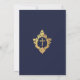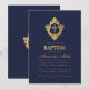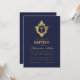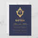 Denna eleganta dopinbjudan i marinblått och guld med en vintagekänsla, rekommenderas för en pojkes dop, har en vinatge floral vapensköld i falskt guld folie, som har ett kors i sig, också i falskt guld folie. Pojkens namn är skrivet med en elegant kalligrafisk stil. All text kan anpassas och har en gyllene färg liknande den falska guld vapenskölden. Bakgrunden är marinblå.