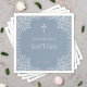 Denna eleganta dammiga blå och silver dopdesign med en vintagekänsla, rekommenderas för pojke, har en utsmyckad falsk silverfolierad ram med invecklade grenar med blad på en dammig blå bakgrund. Ovanför texten finns ett kristet kors, också i falsk silverfolie. Texten har en silvergrå färg lik den falska silverramen.