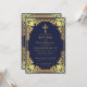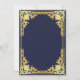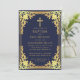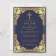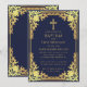 Denna eleganta marinblå och gyllene dopinbjudan med vintage-känsla, rekommenderas för en pojke, har en utsirad gyllene ram med eleganta barocka dekorationer i falskt guld folie på en marinblå bakgrund. Ovanför texten finns ett kristet kors i falskt guld folie. All text kan anpassas och har en gyllene färg liknande den falska silverramen.