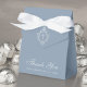 Meddelandet Tack är skrivet i den nedre delen, i ett elegant grått skrivsätt, tillfället och datumet är skrivna i grått versaler under det. Bakgrunden är dammblå.