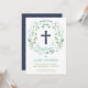 Den här elegant- och söt-paptismen, julklappningsinbjudan, har en illustrerad krans av blommigt med orden "Baptism" som omger ett kor. Du kan ändra texten färg, teckensnittet och meddelandet. Baksidan av inbjudan har en marin bakgrund (som kan bytas ut mot valfri färg) med en vit quatrefoil mönster.