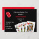 Sängledningsinbjudan i svart och rött med ett pokertema. Grafik av röda pokerchips och spelkort pryder den svarta inbjudan. Anpassa all text för din sängledningsfest.