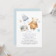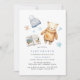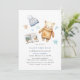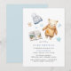 Utkastning av dagskvällda babyduschar med vattenfärgade illustrationer av en nalle, en bok och en baby hatt. Vitt med pastellblå accenter. Könsneutral utformning är perfekt för pojke eller flicka.