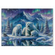 En polar i mor och hennes två unge är sitta på en bank som är täckt av snö framför ett fruset sjö. Snö-täckt linje gräs träd under en natt himmel fylld med norra Ljus. Flera små fåglar vilar på bankerna av sjö. Reaktionen av björnarna och auroran borealis shimmers i vatten.