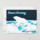 En något stiliserad, blåtonad bild av en Polar Bear (Ursus maritimus) som vilar på polarnas isförpackning på en mörk, månbelyst vinternatt. Texten "Säsongens hälsningar" visas i blått och vitt. Lägg till ytterligare text.