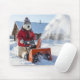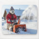 A warmly dressed polar bear operates a snowblower in a snowy landscape, with a wooden cabin in the background surrounded by snow