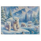 En fredlig vinterscen med polar björnar i ett snöslandskap. Det finns två framstående polar i förgrunden, ett sitta och ett stående, med flera mindre polar i bakgrunden. Inställningen omfattar snö-täckt gräs träd, ett bergsområde under ett kallt himmel, flygande fåglar och ankor vid vatten. Den detaljerade beskrivningen av naturen och djurlivet skapar en lugn atmosfär.