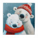 Den här bilden har två polar i ett hjärtklappande omslag, mot en snöig, tealtad bakgrund. Den större björnen bär en röd sticka-hatt, dekorerad med subtil mönster, medan den mindre björnen är inslagen i en ljusröd halsduk. Båda björnarna har mjuka, rosiga kinder och serenuttryck som skapar en mysigt och tillgiven vinteratmosfär. Texturerad, painterly stil förbättrar scenens värme och charm.