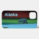 En polar stjäl is under polarnas långa natt, norra Ljus i rött och grönt i avstånd. Texten "Alaska" i ljusblå och vit text visas också.