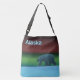 En polar stjäl is under polarnas långa natt, norra Ljus i rött och grönt i avstånd. Texten "Alaska" i ljusblå och vit text visas också.