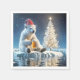 En polar bär en julhatt som håller mugg om öl medan sitta på en isflod bredvid ett dekorerat Julgran