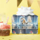 En polar bär en julhatt som håller mugg om öl medan sitta på en isflod bredvid ett dekorerat Julgran