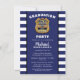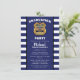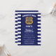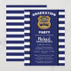 Elegant blå och vit randig inbjudan till examenfest med örnprydd polisemblem med examenår. Design av Holiday Hearts Designs (rättigheter förbehållna).