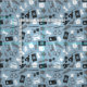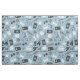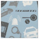 Polistema mönster med polisbil, handklovar, badge och andra liknande symboler och verktyg i grått och vitt över ljusblå bakgrund.