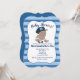Modern stripe baby-polisinbjudan med två färg blått och ett baby med mörk skinn.