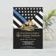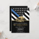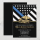 Denna design har en polisflagga med svarta och vita ränder, och en tunn blå rand också. Polishatten och den gyllene texten sitter ovanför alla fester detaljer för den avgående polisen, sheriff, kapten eller chefs avskedsfest detaljer.